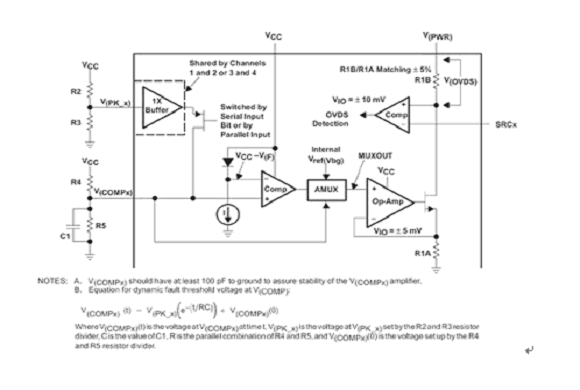 當該特定通道處于“關閉”狀態時,經過編程的 VPEAK(X) 值被反映在 VCOMP(X) 上。如果一個特定通道被開啟,那么過電流檢測的參考電壓就為動態,并且用內部 VPEAK 設置和VCOMP(X) 終端外部組件值表示。