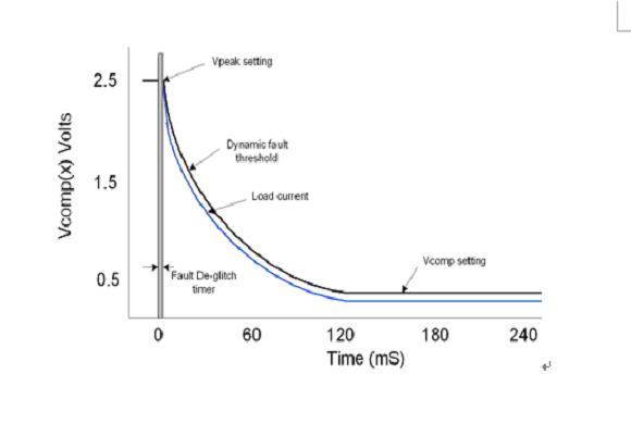 白熾燈的發光照明要求有一個動態故障閾值來對高浪涌電流進行補償,并防止在開啟之初錯誤地觸發過電流條件。一個帶有開關的 RC 網絡的使用可以設置該動態故障的閾值(參見圖1)。通過使用這種方法,可以針對不同的白熾燈泡對短路電流進行優化。在最初的過電流閾值被設置時設置 VPEAK 電壓,然后當在 VCOMP 終端上設置的電阻器分壓器值為恒定不變的 RC 時間常數時進行衰減。每當柵極從“關閉”狀態轉到“開啟”狀態時,便通過一個適當通道的并行或串行輸入比特產生這種可變過電流閾值的波形。
