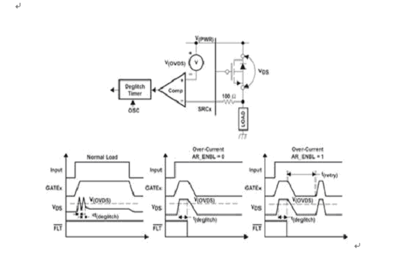 當檢測到一個過電流狀態時,通過“關閉”器件或激活將以低占空比自動重試和 “開啟”FET 的選項設置,就可以對 FET 進行保護。這樣就允許系統不斷地檢查故障是否已經被排除,并且不會破壞 FET。圖3顯示了這種過電流檢測保護的原理圖。
