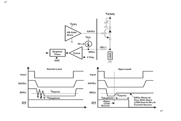 如果檢測到一個開路負載或高阻抗,那么小恒定電流將使開路負載檢測閾值以上的 SRCx 節點發生偏置,進而檢測到故障(見圖4)。
