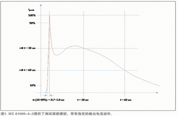目前最常用的ESD抗擾度標(biāo)準(zhǔn)是IEC 61000-4-2標(biāo)準(zhǔn)。該系統(tǒng)級(jí)標(biāo)準(zhǔn)規(guī)定了一個(gè)源極模型,后者包含一個(gè)150pF電荷存儲(chǔ)器(在330 ohm源極電阻后面)和一個(gè)特定的電流放電波形(圖1和表1)。與舊標(biāo)準(zhǔn)規(guī)定的源極相比,大電荷存儲(chǔ)器和低源極電阻使源極模型能交付更多能量和更大電流。