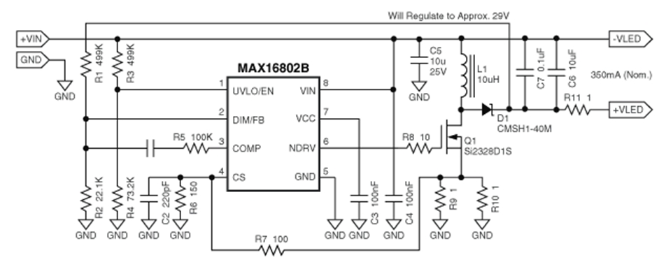 步驟6:R1和R2可選。它們用于調(diào)整+VLED至29V。這在輸出端出現(xiàn)意外開(kāi)路時(shí)非常有用。如果沒(méi)有上述元件的分壓,輸出電壓有可能上升,導(dǎo)致器件損壞。