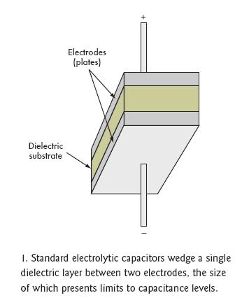 雙電層電容器(EDLC)正如它的字面意義那樣可以解決上述問題,它在相同的封裝內增加了第二個電介層,這個電介層與第一層在中間隔離物的兩邊并行工作(圖3)。EDLC也采用無孔電介質,如活性碳、碳納米管、炭黑凝膠,并選用導電聚合物,其存儲容量要比標準的電解材料高出許多。額外層和更高效電介材料的這種組合能使電容容量提高近4個數量級。
