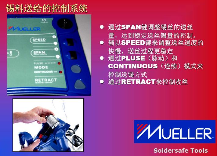 在發(fā)熱功率方面的提高,我們碰到另外一個問題。我們也可以看到951和937,還有新推出來機(jī)器,我們將發(fā)熱功率進(jìn)行對比。他們也花了很多研發(fā)精力來提高發(fā)熱功率,如果在提高發(fā)熱功率之后,確實(shí)能提高生產(chǎn)效率,但是它是不是可以被無限制提升呢?現(xiàn)在的機(jī)器比如到150瓦到160瓦,已經(jīng)上升了3倍,是否還會提高到4倍,這一個效率的提高導(dǎo)致整體效率的提高,我個人不是很贊同。其實(shí)這是比較系統(tǒng)性的解決方案,我們看到MUELLER是通過對工藝改進(jìn)達(dá)到更高的焊接效率。在談到這款機(jī)器之前,我們回顧一下傳統(tǒng)焊接方法作業(yè)的特點(diǎn),我們的圖從左到右看,整個工藝從加熱到預(yù)熱,再繼續(xù)加熱,第四步是添加焊心,然后取走焊嘴,這是非常傳統(tǒng)的焊接工藝,反過來看,我們看到整個焊接過程中,雙手是被限制的。從第二張圖開始,都是靠手去拿,關(guān)鍵是控制在雙手被占用。過程等待時間會很長,我們可以看到實(shí)際作業(yè)過程中下面三步是真正起到作用,前面預(yù)熱當(dāng)然是準(zhǔn)備工作,但是在這個工作中,我們雙手等待的時間會非常長。第三個,作業(yè)效率不是特別穩(wěn)定,因為我們送錫的時候,以及拿走錫絲過程中依賴員工本身的技巧和技術(shù)。