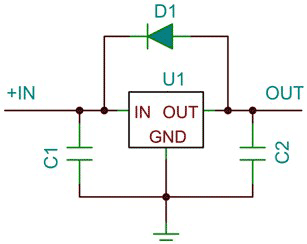 另一個動態(tài)性能變量是輸出噪聲。通過增加穩(wěn)壓器輸出端的濾波器電容一般可以降低輸入紋波和輸出噪聲,但是會延長瞬態(tài)恢復(fù)時間。線性穩(wěn)壓器的運行依賴于一個內(nèi)部增益級。為了防止該增益級出現(xiàn)振蕩,通常會需要一個最小輸出濾波器電容(請參見圖1中的C2)。一個輸入濾波器電容(請參見圖1中的C1)將有助于穩(wěn)壓器服務(wù)于瞬態(tài)負(fù)載,尤其是在穩(wěn)壓器遠(yuǎn)離電源時更需要這樣一個輸入濾波器電容。許多穩(wěn)壓器都不容許存在反向電壓。如果輸出電容被充電至輸出電壓,同時輸入短路至接地,那么穩(wěn)壓器將出現(xiàn)反向電壓,并且在所有電路獲得放電以前穩(wěn)壓器都會鎖閉在某種未知狀態(tài)中。這種故障狀態(tài)可能會引起穩(wěn)壓器自毀。為了避免出現(xiàn)這種故障模式,可能會需要一個反向二極管鉗位(請參見圖3)。