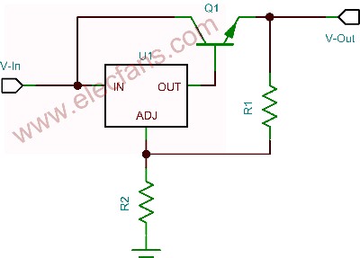 計算過程中輸入電流的使用,使得穩(wěn)壓器靜態(tài)或接地電流均得到考慮。在要求負(fù)載電流大于穩(wěn)壓器承受能力的情況下,可以添加一個外部晶體管,如圖4所示。這種做法僅適用于可調(diào)輸出穩(wěn)壓器。