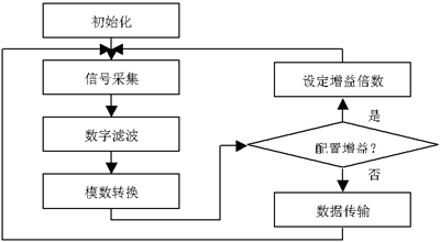 測量時使用內部參考電壓,測量信號的電壓輸入范圍為0~500mV,當輸入信號滿量程輸入,模數轉換輸出的最高位不為1時,可進行信號放大,最大放大倍數可達32。當輸入信號的放大倍數為N時,輸入信號的范圍會相應地縮小為原來的1/N。例如,當選擇PGA的放大倍數為2倍時,測量信號的電壓輸入范圍為0~250mV。