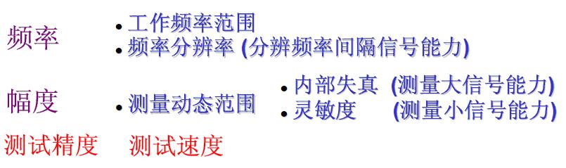 頻譜分析儀的基本性能指標如下圖所示,包括頻率、幅度以及測試精度和測試速度。