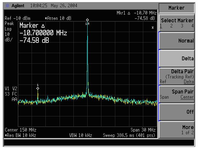 屏幕圖像下端的黃色跡線表示在輸入混頻器被過度激勵時的內部失真。衰減為零。藍色跡線表示當衰減設置為10dB時,雜散信號所減少的電平。