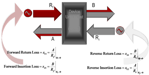 S11定義為端口1反射的能量占端口1入射信號的比例,S21定義為傳輸到DUT端口2 的能量占端口1入射信號的比例。參數S11和S21為前向S-參數,這是因為入射信號來自端口1的射頻源。對于從端口2入射信號,S22為端口2反射的能量占端口2入射信號的比例,S12為傳輸到DUT端口1的能量占端口2入射信號的比例。它們都是反向S-參數。