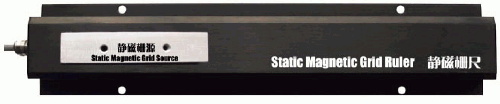 靜磁柵位移傳感器由“靜磁柵源”和“靜磁柵尺”兩部分結合使用。“靜磁柵源”使用鋁合金壓封無源釹鐵硼磁柵組成磁柵編碼陣列;“靜磁柵尺”用內藏嵌入式微處理器系統(tǒng)的特制高強度鋁合金管材封裝,使用開關型霍爾傳感器件組成霍爾編碼陣列,鋁合金管材外部使用防氧化鍍塑處理。“靜磁柵源”沿“靜磁柵尺”軸線作無接觸(相對間隙寬容度和相對姿態(tài)寬容度達50mm)相對運動時,由“靜磁柵尺”解析出數(shù)字化位移信息,直接產(chǎn)生高于毫米數(shù)量級的位移量數(shù)字信號。充分發(fā)掘嵌入式微處理器的資源,將數(shù)據(jù)更新速度提高到毫秒數(shù)量級,以便能適應5m/S以下運動速度的位移響應。