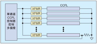CCFL已在筆記型電腦、數(shù)位相機(jī)、導(dǎo)航系統(tǒng)以及其他具有較小LCD螢?zāi)坏脑O(shè)備中使用多年。這些類型的設(shè)備通常只用一個(gè)CCFL,因此,傳統(tǒng)設(shè)計(jì)只用一個(gè)CCFL控制器。隨著大尺寸LCD面板的出現(xiàn),帶來對多CCFL的需求,有必要采用新的方式來應(yīng)對這種新的需求。可能的方式之一是采用一個(gè)單通道CCFL控制器來驅(qū)動(dòng)多個(gè)燈(圖5)。這種方式中,CCFL控制器只透過其中的一個(gè)燈來監(jiān)測燈電流,而以幾乎相同的交流波形同時(shí)驅(qū)動(dòng)所有并聯(lián)的燈。然而,這種方式存在著幾個(gè)缺陷。