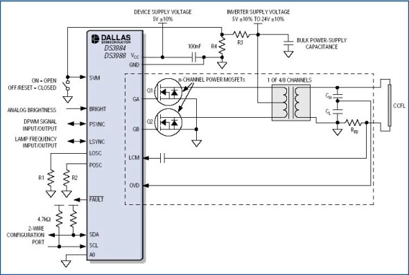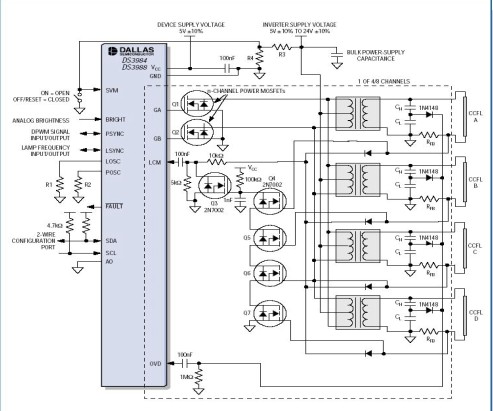 DS3984/DS3988采用推挽驅(qū)動(dòng)架構(gòu),可以使用更低成本、更高效率的n通道MOSFET。轉(zhuǎn)換器直流電源電壓也可采用更高的電壓。單獨(dú)的燈控制和監(jiān)測可提供均勻的亮度,并減少轉(zhuǎn)換器的元件總數(shù)。采用單獨(dú)的燈控制時(shí),如果某一個(gè)燈失效,僅會(huì)使這個(gè)失效的燈停止工作,其他燈繼續(xù)工作,并不會(huì)受影響。片上振蕩器產(chǎn)生的燈頻和脈沖調(diào)光頻率被嚴(yán)格限定在±5%水準(zhǔn),消除了對於顯示影像的影響,并且也可被同步至外部時(shí)脈源。