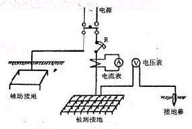 最初人們對接地電阻的測量是用伏、安法,這種試驗是非常原始的。圖1是用安培計、伏特計的測量方法。在測定電阻時須先估計電流的大小,選出適當截面的絕緣導線,在預備試驗時可利用可變電阻R調整電流,當正式測定時,則將可變電阻短路,由安培計和伏特計所得的數值可以算出接地電阻。