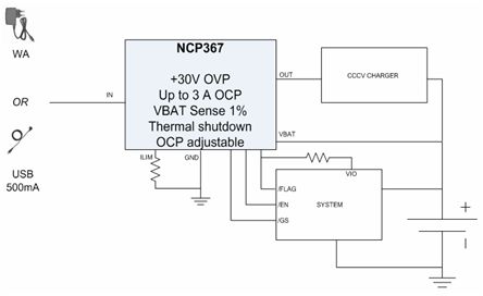 以NCP367為例,這是一款提供+30 V過壓保護(hù)及高達(dá)3 A過流保護(hù)、帶電池電壓檢測功能的保護(hù)IC(見圖5)。這器件保護(hù)便攜設(shè)備電池免受輸入過壓(在出現(xiàn)故障工作條件下會斷開系統(tǒng)與Vbus或AC-DC適配器的連接)、充電過流及充電過壓影響。NCP367提供最大值100 mΩ的低導(dǎo)通阻抗,幫助降低方案成本及電路板占用空間。支持高達(dá)3 A電流的能力幫助實(shí)現(xiàn)快速充電。典型值50 μA的極低電流消耗兼容于USB 500 μA閑置模式。這器件能用于1.5 A或500 mA兩種充電電流等級,非常適合手機(jī)等應(yīng)用。