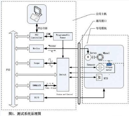 系統(tǒng)原理如圖1,傳感器測試系統(tǒng)的核心是PXI系統(tǒng),主要由控制器、萬用表模塊、示波器模塊、數(shù)字I/O模塊、矩陣開關(guān)模塊、運(yùn)動控制模塊等組成。PXI系統(tǒng)內(nèi)部通過PXI總線進(jìn)行數(shù)據(jù)傳輸。