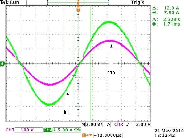 圖5:低壓線路的VIN和IIN波形(VIN=110V,負載=1100W,THD=2.23%,PF=0.998)