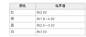 LED具有一般硅二極管的類似特性,在正負極之間施加電壓。當外加電壓達到一個臨界值,LED中產生電流,開始發光。當電壓超過這個臨界值時,電流急劇增加。白色LED的臨界電壓值約3.5V。紅色、綠色、藍色的LED臨界電壓值如表1所示。