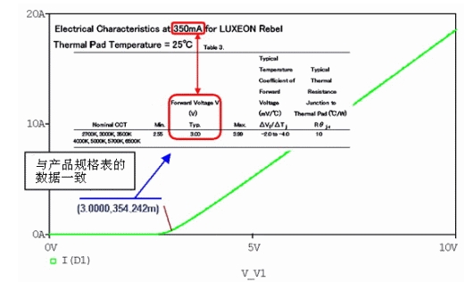 我們用電路仿真來說明LED的電子特性以及驅動電路。電路仿真是對LED和電阻等的電子設計進行建模并在計算機上模擬計算電路運行的一種簡易方法。這里使用的是Cadence公司的電路仿真PSpice A/D。同時使用了飛利浦照明公司的LUXEON系列LX3-PW71。