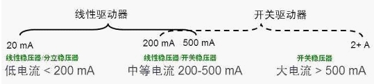 如今在市場上典型的LED驅動器包括兩類,即線性驅動器和開關驅動器;大概的適用范圍見圖5.如電流大于500mA的大電流應用采用開關穩壓器,因為線性驅動器限于自身結構原因,無法提供這樣大的電流;而在電流低于200mA的低 電流應用中,通常采用線性穩壓器或分離穩壓器;而在200至500mA的中等電流應 用中,既可以采用線性穩壓器,也可以采用開關穩壓器。