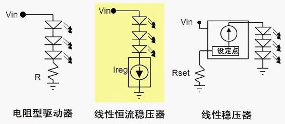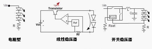 例如在采用DC-DC電源的LED照明應用中,可以采用的LED驅動方式有電阻型、線性穩壓器及開關穩壓器等,基本的應用示意圖見圖7。