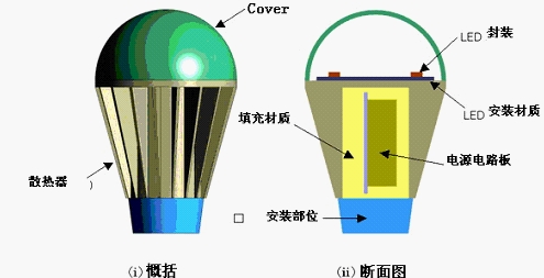 要避免電子設備的發熱有多種方法。比如,加散熱器,在熱源周圍安置能提供冷氣的風扇。前者是通過增加散熱面積,來增加散熱的通道,后者是使熱不在熱源周圍聚集。但是,正如圖1 LED燈的概括圖所示,LED封裝時不能直接連接散熱器,也沒有安裝風扇的位置。而且內部電源電路板也會產生熱量,因此LED燈的散熱問題可以說是一個非常棘手的問題。這樣,如何有效使用LED安裝材質和散熱器就變得很重要。
