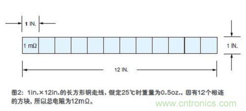 我們舉一個簡單的例子。圖2是一條長方形的銅走線,在25℃時其重量約為0.5oz.,走線寬度為1英寸,長度為12英寸。我們可以將走線分解成一系列方塊,每個方塊邊長都是1英寸。這樣,總共就有12個方塊。按照表2,每個0.5oz.重的銅箔方塊的電阻為1mΩ,現在共有12個方塊,因此走線的總電阻為12mΩ。