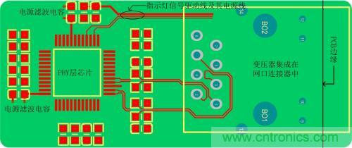 c)網(wǎng)口變壓器PHY層芯片側中心抽頭對地的濾波電容要盡量靠近變壓器管腳,保證引線最短,分布電感最小;