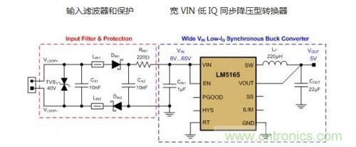 圖 2:脈沖頻率調(diào)制 (PFM) 同步降壓型轉(zhuǎn)換器原理圖,包括一個 EMC 濾波器和保護(hù)電路