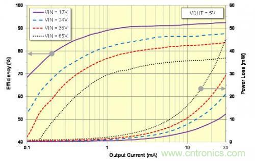 LM5165 中內(nèi)置的面向智能傳感器應(yīng)用的各種特性包括一種用于實(shí)現(xiàn)最佳解決方案尺寸的簡單控制架構(gòu)、用于提供低壓差的 100% 占空比能力、一個用于電源軌排序和故障報告的漏極開路電源良好指示電路、在內(nèi)部固定或從外部可調(diào)的軟起動 (SS)、以及具有可定制遲滯以提供可編程線路欠壓閉鎖 (UVLO) 功能的高精度啟用。而且,一種可調(diào)的逐周期電流限制優(yōu)化了電感器選擇和尺寸。圖 3 顯示出了對于 0.1mA 至 30mA 負(fù)載電流的轉(zhuǎn)換器效率和功率耗散。