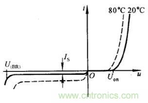 在環(huán)境溫度升高時,二極管的正向特性曲線將左移,反向特性曲線將下移,如圖1所示。在室溫附近,溫度每升高1℃,正向壓降減小2~2.5mV;溫度每升高10℃,反向電流約增大一倍。可見,二極管的特性對溫度很敏感。