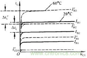 溫度對輸出特性的影響:如圖3實線,虛線分別所示為20℃和60℃時的特性曲線,可見,溫度升高時,由于輸入特性左移,導(dǎo)致集電極電流增大。