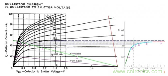 圖中假定電源電壓為4V,綠色的斜線是負載電阻為80歐姆的負載線,V/R=50MA,圖中標出了Ib分別等于0.1、0.2、0.3、0.4、0.6、1.0mA的工作點A、B、C、D、E、F。據此在右側作出了Ic與Ib的關系曲線。根據這個曲線,就比較清楚地看出“飽和”的含義了。曲線的綠色段是線性放大區,Ic隨Ib的增大幾乎成線性地快速上升,可以看出β值約為200。蘭色段開始變彎曲,斜率逐漸變小。紅色段就幾乎變成水平了,這就是“飽和”。實際上,飽和是一個漸變的過程,蘭色段也可以認為是初始進入飽和的區段。在實際工作中,常用Ib*β=V/R作為判斷臨界飽和的條件。在圖中就是假想綠色段繼續向上延伸,與Ic=50MA的水平線相交,交點對應的Ib值就是臨界飽和的Ib值。圖中可見該值約為0.25mA。