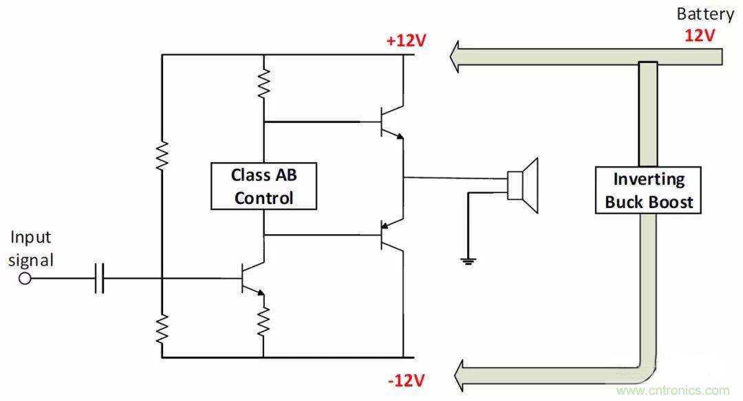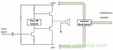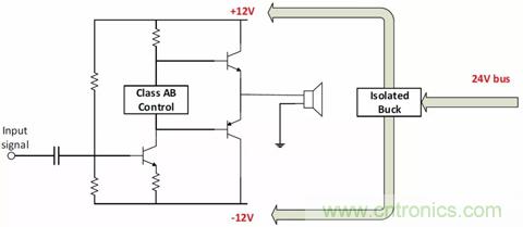 為這類應(yīng)用選擇合適的拓?fù)鋾r(shí),需要考慮輸入電壓。例如,為以±12V軌運(yùn)行的音頻放大器供電,如果輸入電源軌是24V,就選擇隔離式降壓拓?fù)洹H绻褂?2V電池,就可以用反相降壓-升壓拓?fù)洌陨韶?fù)壓軌。如果使用5V USB、12V電池或綠色能源供電的系統(tǒng),就應(yīng)該采用隔離式降壓-升壓拓?fù)洹D12說明了如何用各種拓?fù)浣o音頻放大器供電。
