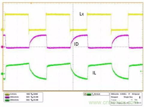在高壓側(cè)開關(guān)接通的周期中(圖5中綠色箭頭指示電流),電感器電流斜坡上升,將能量儲(chǔ)存在電感器中,輸出電容器向負(fù)載提供電流。在低壓側(cè)開關(guān)接通的周期中(圖5中紅色箭頭指示電流),電感器電流斜坡下降,向負(fù)載提供電流,并為輸出電容器充電。ISL85415EVAL2Z反相降壓-升壓電路板的工作波形如圖6所示。