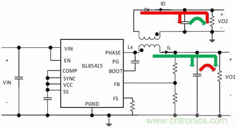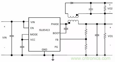 在圖3中,我們展示了一種雙正輸出的拓?fù)洹R杀秹浩骰?個(gè)不同的正電壓,次級(jí)輸出的負(fù)端子可以連接到正主輸出上,如圖9所示。