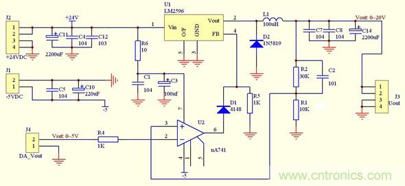 如果我們能夠設(shè)計出一種可以用電壓調(diào)節(jié)輸出的開關(guān)穩(wěn)壓電路,然后用DAC來控制調(diào)節(jié)電壓,那么就很容易實現(xiàn)。問題是我們不可能自己重新設(shè)計一個DC-DC,如果能把現(xiàn)成的DC-DC集成芯片,通過修改外圍電路的方式,來實現(xiàn)用電壓來控制輸出,那么問題就得到解決。下面,我還是以LM2596-Adj為例,看看怎樣把LM2596-Adj改裝成可數(shù)控的開關(guān)穩(wěn)壓電源。