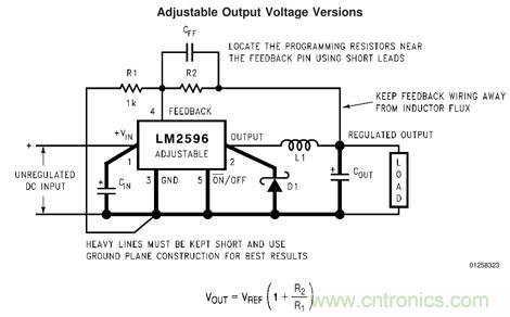 DC-DC開關(guān)穩(wěn)壓電路由于其高效率、大電流的優(yōu)點被廣泛使用??烧{(diào)DC-DC可以通過調(diào)節(jié)反饋分壓電阻來調(diào)節(jié)輸出電壓。圖1是常用DC-DC降壓穩(wěn)壓芯片LM2596-Adj的典型應(yīng)用電路,通過調(diào)節(jié)R1和R2就可以得到所需輸出電壓。