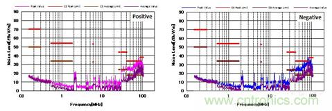圖4顯示了增加CM和DM濾波器后的噪聲特性。 與圖3相比,CM濾波器的增加降低了近20dBμV/ m的CM噪聲。 并且EMI性能也通過了CISPR25 C5標準。