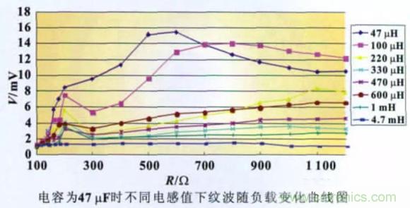 圖10 所示為在不同電容值(貼片鉭電解)下,改變電感和負載并測量負載上的電源紋波有效值所得出的曲線圖。