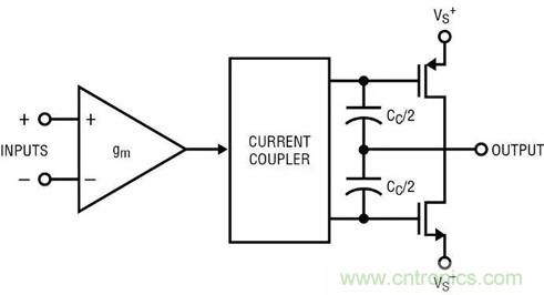 圖 1a 顯示了一個非軌至軌放大器的方框圖。輸入控制 gm 方框,gm 方框驅動增益節點,并在輸出端得到緩沖。補償電容器 Cc 是主要的頻率響應組件。Cc 的返回引腳應該接地,如果有這樣一個引腳的話;但是運算放大器傳統上不接地,電容器電流會返回一個或兩個電源。圖 1b 是最簡單的軌至軌輸出放大器的方框圖。輸入方框 gm 的輸出電流通過“電流耦合器”發送,這將驅動電流分成兩部分,提供給輸出晶體管。頻率響應由兩個 Cc/2s 決定,二者實際上是并聯的。