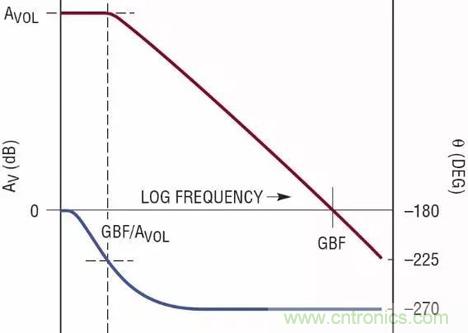 以上兩種拓撲代表了絕大多數使用外部反饋的運算放大器。圖 1c 顯示了我們的理想放大器的頻率響應,盡管兩個電路的電氣原理不同,但行為表現卻類似。由 gm 和 Cc 形成的單極點補償提供 GBF = gm/(2πCc) 的單位增益帶寬積頻率。在 GBF/Avol 附近,這些放大器的相位滯后從 –180° 降至 –270°,其中 Avol 是放大器開環 DC 增益。當頻率遠高于這個低頻率時,相位就一直停在 –270° 上。這就是為人熟知的“主極點補償”,其中 Cc 極點主導頻率響應,隱藏了有源電路的各種頻率限制。