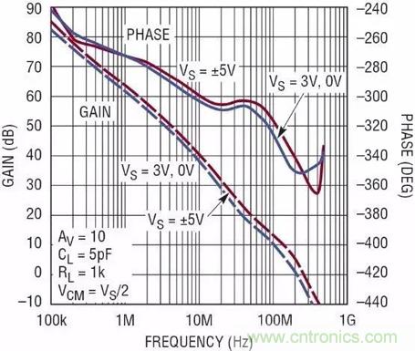 圖3:LT6230-10的增益和相位隨頻率的變化
