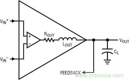 此外,任何放大器都有 20nH 至 70nH 的電生電感,尤其是雙極型器件。器件的有限 Ft 將輸出晶體管的寄生基極電阻變成電感。危害是,Lout 與 CL 可能相互作用,形成一個串聯諧振電路,那么同樣的問題又來了,如果環路中沒有更大的相位滯后,串聯諧振電路的阻抗就可能降至 Rout 無法驅動的水平,從而可能產生振蕩。例如,設定 Lout = 60nH 和 CL = 50pF。諧振頻率