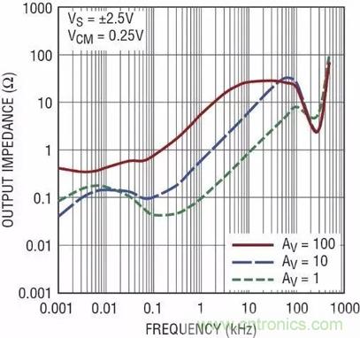 圖6:在3種增益情況下,LTC6268輸出阻抗隨頻率的變化