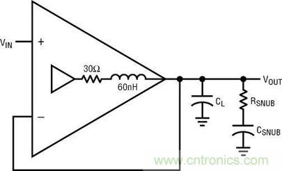 防止負載電容引起振蕩的最常見方式是,在反饋連接之后,簡單地給電容串聯一個小阻值的電阻器。10Ω 至 50Ω 的阻值將限制容性負載可能引起的相位滯后,并在速度非常高的時候,隔離放大器和低容性阻抗。缺點包括隨負載電阻特性而變化的 DC 和低頻誤差、容性負載頻率響應受到限制、以及如果負載電容在電壓變化時不恒定所導致的信號失真。