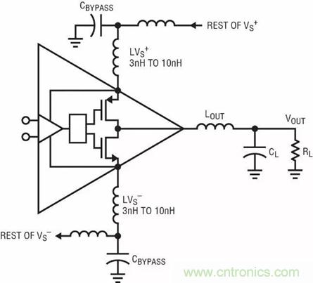 最后一個需要考慮的振蕩源是電源旁路。圖 10 顯示了輸出電路的一部分。LVS+ 和 LVS– 是不可避免的封裝、IC 接合線、旁路電容器的物理長度 (像任何導體一樣也是電感性的) 以及電路板走線的串聯電感。還包括將局部旁路組件連接到電源總線其余部分 (如果不是電源平面) 的外部電感。盡管 3nH 至 10nH 看起來似乎不大,但是在 200MHz 時,就是 3.8 至 j12Ω。如果輸出晶體管傳導大的高頻輸出電流,那么在電源電感兩端會存在壓降。