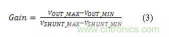 計算放大器的增益。運算放大器放大VSHUNT以產(chǎn)生VOUT_MIN到VOUT_MAX的輸出電壓擺幅,其中VOUT_MIN和VOUT_MAX分別是放大器的最小和最大輸出擺幅極限。公式3用于計算放大器產(chǎn)生所需的輸出擺幅的增益: