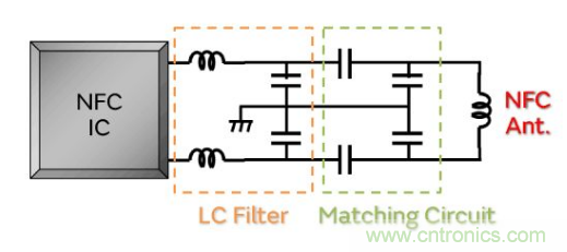 ANFC電路由NFC的IC、LC濾波器、匹配電路、天線構成。