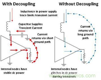 圖 2 闡述了為什么去耦非常重要。需要注意的是,電源線跡的電感將限制暫態電流。